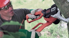 A 100mm cutting capacity, combined with the 550W motor, allows you to accomplish tasks a manual lopper can’t quite handle. The familiar scissor action makes it a friendly tool for people who find it daunting to use a chainsaw. What’s more, the patented jaws have been made to protect the user from the moving cutting chain. The tool is fitted with lopper-style dual switch handles, so it will only work if powered with two hands.