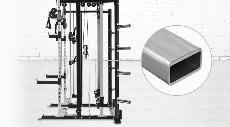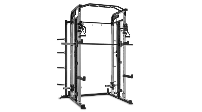 This machine combines the capabilities of a cable pulley machine, a smith machine, and a power rack for a reliable multi-functional machine.