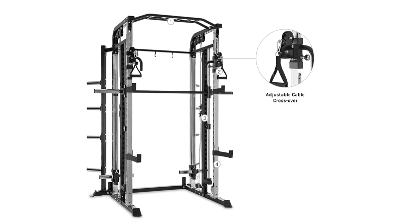 This equipment offers the benefits of a smith machine, power rack and cable pulley machine all in one so you can complete an entire routine without having to switch to a different one. This makes your training sessions more efficient. The frame is built for ultra durability and stability so you can have a comfortable workout time and time again. It also doubles as storage so you can keep your weight plates and bars in one place.