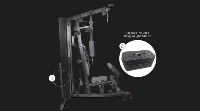 The ergonomic design ensures a comfortable and stable workout for all, with components that are flexible to your needs. Having an inclusive equipment means you can save space and time by not having to fuss over multiple machines and equipment. You can challenge yourself with a variety of workouts to engage your whole body from shoulders to calves and everything in between. This package includes an add-on 25kg weight stack which brings the total weight to a whopping 103kg. Every component is made to last with heavy duty cables, strong stitching and a high quality steel frame ensuring it can endure the toughest of workouts.