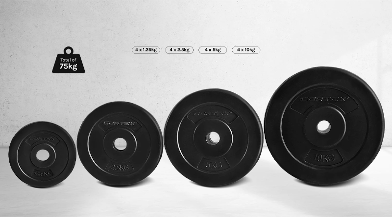 The set comes with a generous range of four sets of varying weights with a total weight of 85kg, including the barbell.