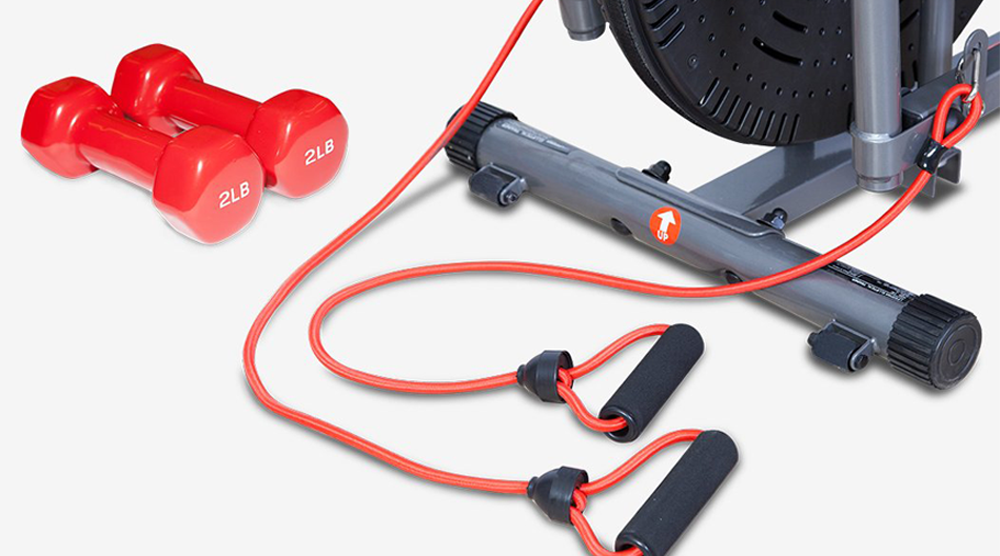 Change it up and work different muscle groups with forward and backward pedalling motion. Increase the intensity with an easy twist of a dial and check your workout progress at a glance on the LCD display. You can enjoy a complete workout with just one machine with the additional dumbbells and a pair of resistance band handles within easy reach.