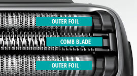 The 3-Blade cutting system ensures a close and consistent shave with each stroke. Two outer foils, comb blades, and inner blades work in tandem to capture and cut hair as close as possible to the roots.