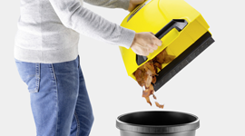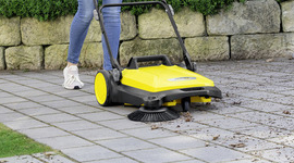 The long bristles of the side brush ensure thorough cleanliness right to the edge. The infinitely variable push handle can be optimally adapted to the height of the respective user. Thanks to the bayonet fitting screws can no longer get lost when adjusting the height. The sweeper can be easily collapsed as required without stooping thanks to a footplate at the frame and carried by the handle – for space-saving storage. The tool-free side brush attachment is unique. The sweeper is ready for use in no time. The waste hopper can be easily removed and safely put down and emptied without any contact with dirt.