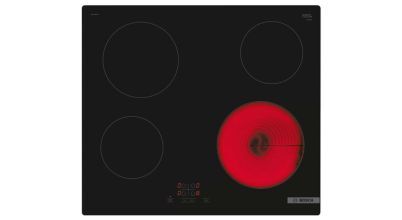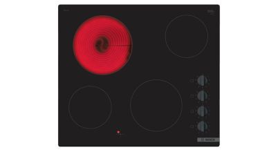A practical ceramic glass cooktop from Bosch, this unit features four cooking zones and side-mounted knob controls. Nine power levels per zone give basic temperature control for everyday meals. A residual heat indicator improves user safety by showing which zones are still hot. Its frameless design allows for easy cleaning and gives a sleek modern look.