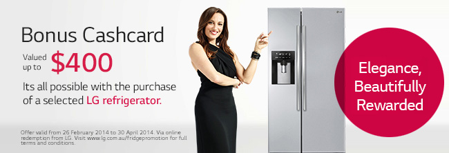 Purchase any participating LG Refrigerator during the promotional period to receive an LG EFTPOS Cashcard valued up to $400.