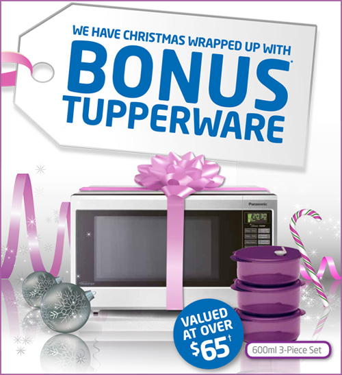 Claim your genuine Tupperware 3-Piece Set when you purchase a selected Panasonic Inverter Microwave from 1/11/13 to 24/12/13. Tupperware Heat 'N Eat 3 x 600ml set is valued at $69 RRP.*