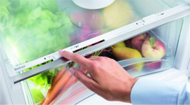 The BioCool drawer helps preserve your fresh produce with precision. How long produce lasts depends on temperature and humidity. The BioCool drawer maintains the optimal temperature for ideal preservation. The more water a food contains, the more moisture it needs to stay fresh and the BioCool slider setting lets you adjust the humidity level depending on the food being stored.