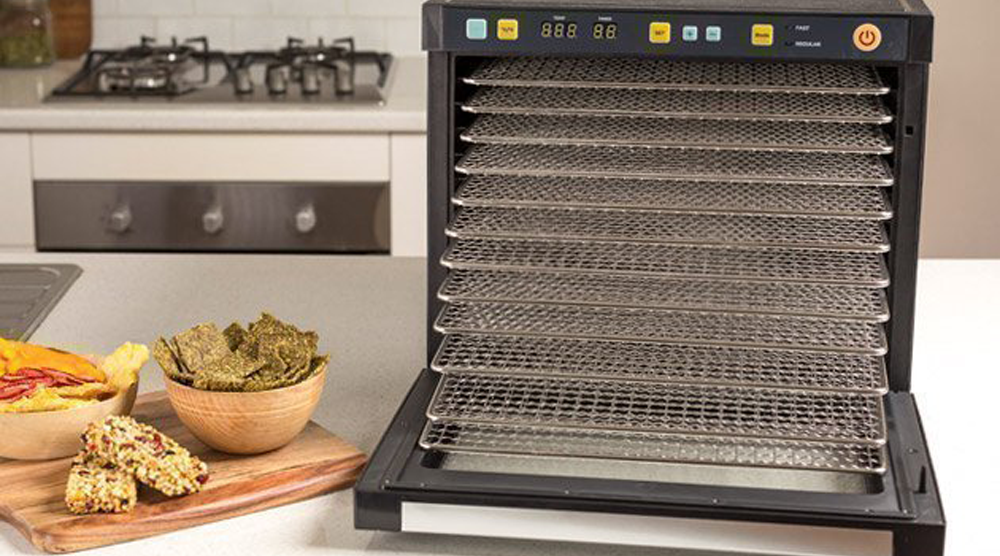 Part of BioChef’s Savana range, this dehydrator boasts a generous 12-tray capacity. That’s plenty of room to neatly arrange sliced apricot or kiwi fruit, and you can remove shelves when you require the space for making yoghurt. BioChef’s Dual Fan Technology allows you to prepare smaller batches without using unnecessary energy, and you can choose either a Fast or Regular drying mode depending on your food’s water content. Once the moisture is drawn out, the Two-Stage Sequential Temperature Timer will keep your food in Warm mode to prevent water from re-entering your food.
