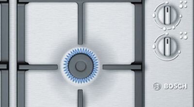 The 60cm Serie 2 Natural Gas Cooktop from Bosch features four gas burners across an ergonomic cooking surface. One of the burners is the dual wok burner, which delivers powerful cooking, ideal for rapid heating, fast boiling, and amazing sizzling.