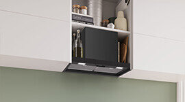 Its carbon black matte finish is not only visually striking but also fingerprint-resistant, maintaining a clean, refined appearance with minimal upkeep. Designed for flush installation within an upper kitchen cabinet, it blends discreetly into cabinetry while delivering high-performance air extraction. This unit supports both ducted and recirculated modes, offering flexibility to suit a range of kitchen configurations.