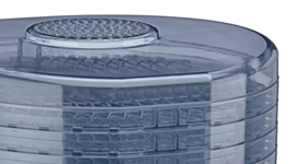 This dehydrator features five stackable, interlocking drying trays. This design makes the unit excellent in kitchens with limited space, but you also have the option to stack an extra four trays (purchased separately) if required.