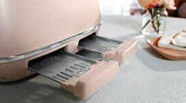 The toaster features a special crumb tray that slides out completely, making cleaning effortless and keeping your kitchen tidy with ease.
