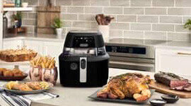 With a hinged lid, removable bowl, anti-scratch coating, and more, the design of the air fryer makes for easy use and clean up.