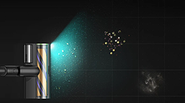 For improved visibility, the brush features integrated blue LED lighting that helps reveal hidden dust and debris along floors and edges. Smart sensors further enhance cleaning by detecting dirt levels and automatically adjusting suction power to match the cleaning task, ensuring efficient performance while conserving battery life.