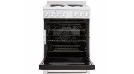 The cavity cooling system maintains external surfaces at safe temperatures, while the double-glazed oven door helps retain internal heat, boosting energy efficiency. Designed in a clean white finish, the unit’s control dials offer intuitive operation for both the oven and solid cooktop, giving users precise control over their cooking environment. Whether baking, roasting, grilling, or simply preparing everyday meals, this freestanding electric cooker delivers reliable performance in a sleek and user-friendly package.