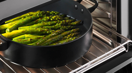 The oven’s glass door is triple glazed, which not only helps to lock in heat to improve energy efficiency, but also keeps the exterior of the door cooler to the touch.