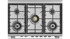 The five-burner sealed gas cooktop includes dual wok and semi-rapid burners for both high-intensity searing and delicate simmering. Each burner features precision control for immediate heat adjustments, allowing you to cook with confidence and consistency. Durable brass components and dishwasher-safe trivets ensure lasting quality and easy maintenance.