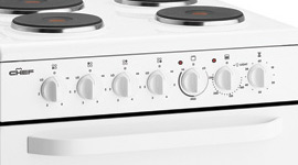 This classic Chef electric stove has been designed to offer simplicity and convenience. And thanks to its separate grill you can cook a number of dishes at once!; Solid electric hotplates and a removable glass door make the appliance easy to clean while the oven light and timer will help to keep your cooking organised.