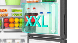 A spacious XXL door balcony provides flexible storage for larger and taller items often used throughout the day. From full milk cartons and juice bottles to rows of canned drinks, the expanded door compartment keeps beverages organised and easy to access while freeing valuable shelf space within the main fridge interior.