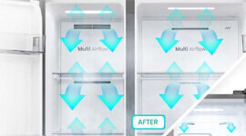 The Multi Airflow system circulates chilled air throughout the refrigerator, helping maintain an even temperature across every shelf. By distributing cooling consistently, it supports the preservation of fresh ingredients and everyday groceries. Whether placed high or low, stored items benefit from a balanced environment designed for dependable refrigeration.