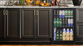The sleek black interior and shelving create a sharp, professional appearance that enhances the look of any bar or beverage display area, while also providing easy organization of stock.