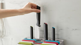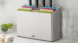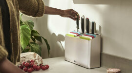 Elevate the look of your kitchen benchtop with the Joseph Joseph Folio Plus 8-Piece Knife and Chopping Board Set.