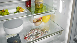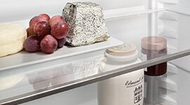 Liebherr’s separable GlassLine shelves offer flexible storage for taller items. Slide the front half beneath the rear to create space for bottles, jugs or containers, without sacrificing shelf space elsewhere. Made from safety glass and trimmed in stainless steel-look accents, they’re as durable as they are refined.