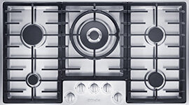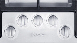 This Miele gas cooktop is equipped with GasStop & Restart functionality for maximum safety. If the gas flame is temporarily extinguished, e.g. because a pan boils over or due to a draught, a flame failure device will recognise this and initiate an automatic reignition. If this does not work, the gas supply is switched off immediately – simple and safe.