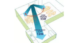 Advanced airflow modes deliver coverage up to 12 metres with adjustable direction up to 150 degrees. This ensures consistent cooling throughout larger rooms, eliminating hot spots and improving overall comfort in open-plan living areas.