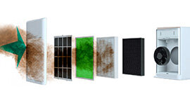 The multi stage filtration system combines several filter layers to capture airborne particles such as dust, allergens and smoke while the activated carbon layer helps reduce unwanted household odours for cleaner indoor air.