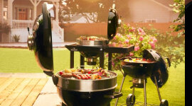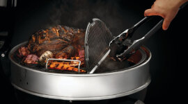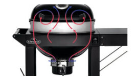 Designed for precision, the cast iron cooking grids feature three adjustable heights and are hinged for quick charcoal top-ups and effortless use of wood chips or water pans. Napoleon's Vortex heat management system enhances convection airflow, resulting in more even cooking, improved searing, and better fuel efficiency. The porcelain-enamelled lid and bowl retain heat effectively, while the Smoke Stack Chimney ensures consistent airflow even in breezy or wet conditions.