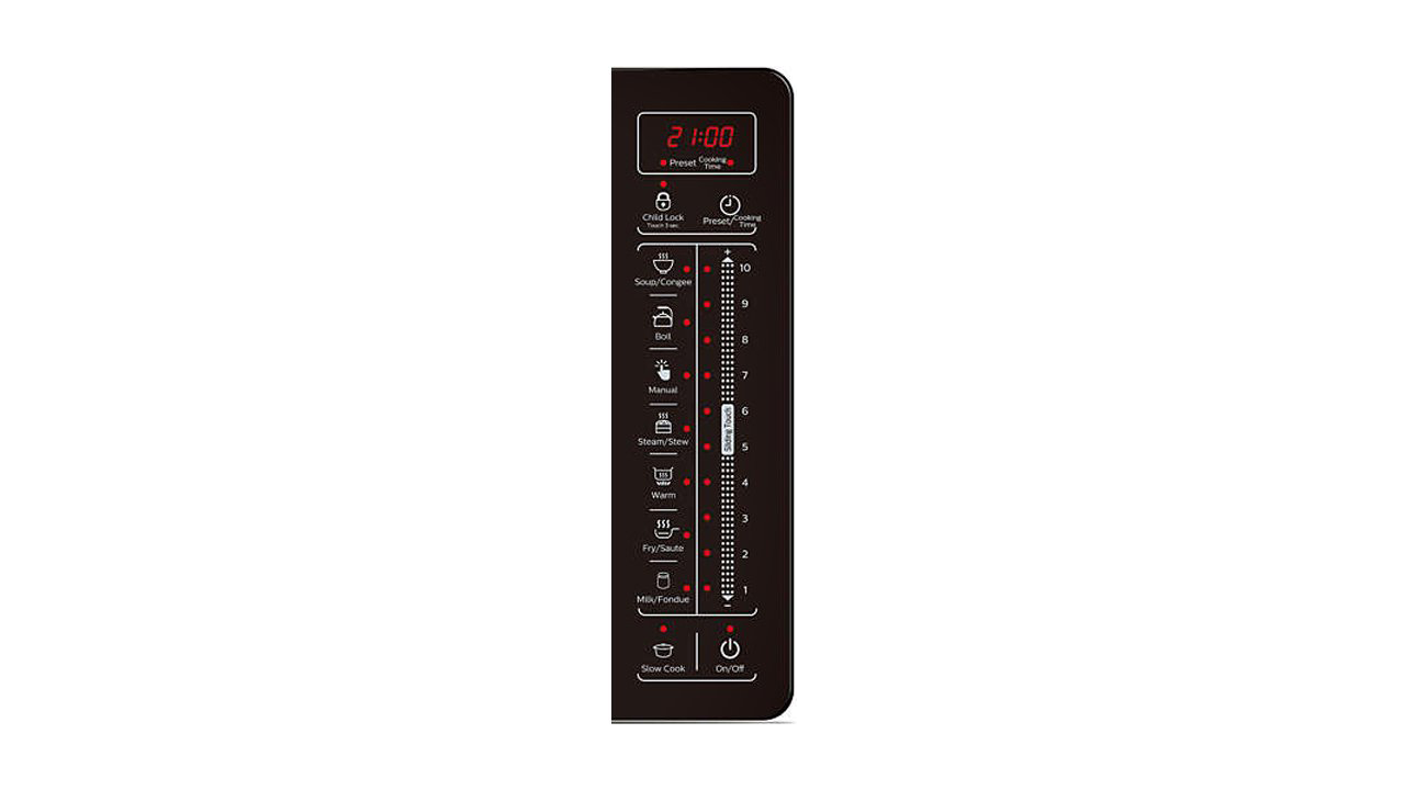 The cooktop is built with high-efficiency magnetic coils to heat up to the maximum temperature almost instantly. You have the choice of 10 temperature settings, so you’re covered for all sorts of culinary tasks, from slow simmering to fast frying. Slide touch control technology allows you to adjust your temperature with ergonomic ease, and the flush design of the controls will withstand many years of regular use. Save time and remove the guesswork from your recipes with eight preset meal programs, catering to everything from soup and congee to milk and fondue. Additionally, a 24-hour timer on selected programs will allow you to plan your meals ahead of schedule.