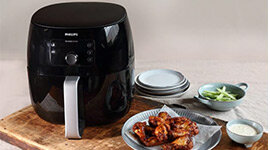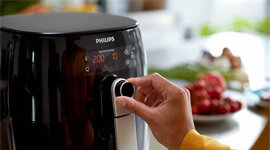 This airfryer owes its fat-burning ability to Philips’ patented Twin TurboStar technology. This technology, combined with 2250 watts of heat, sends a tornado of hot air throughout the cooking basket to literally melt fat away from your food. The fat collects at the bottom of the airfryer for convenient disposal.