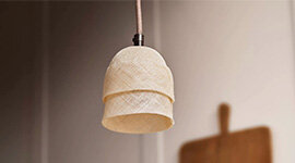 Taking inspiration from the flared shape of a foxglove flower, the shade is crafted from abaca fibre, which is a traditional plant-based material known for its strength and natural lustre. Each shade is hand-formed over a custom mould while wet, then dried into a graceful bell shape and hand-stitched in subtly layered bands. When lit, the pendant comes alive with warmth and texture, with each layer softly filtering light to create a beautiful glow.