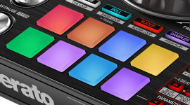 The Performance Pads provide an easy way to activate pre-mapped functions and a visual reference to which effects are active through backlighting. Trigger Hot Cues, Roll, Slicer, Sampler, Pitch Play, Slicer Loop, Cue Loop and Saved Loop from the Pads.