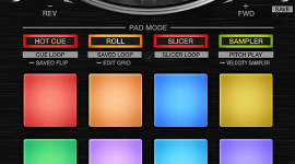 The Performance Pads provide an easy way to activate pre-mapped functions and a visual reference to which effects are active through backlighting. Trigger Hot Cues, Roll, Slicer, Sampler, Pitch Play, Slicer Loop, Cue Loop and Saved Loop from the Pads.