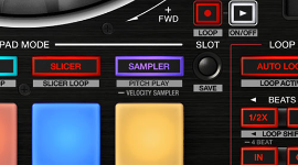 The Performance Pads provide an easy way to activate pre-mapped functions and a visual reference to which effects are active through backlighting. Trigger Hot Cues, Roll, Slicer, Sampler, Pitch Play, Slicer Loop, Cue Loop and Saved Loop from the Pads.