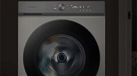 The Bespoke design features a sleek, modern aesthetic with a refined finish that enhances contemporary laundry spaces. It combines style with practicality, allowing the appliance to integrate seamlessly into a variety of home interiors.