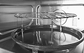 The interior is stainless steel, which can be easily wiped clean, and helps reflect and evenly spread heat throughout the chamber for consistent cooking. In addition to the usual microwave turntable, the appliance also comes with 2 standing metal racks, which is useful for grilling.