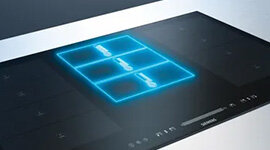 Two Flex zones and an extended Flex zone allow pots and pans of almost any shape or size to be placed freely, even laterally. The cooktop detects the size and position of the cookware, automatically joining or separating zones for optimum heat coverage.
