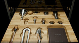 Crafted from fine Slavonian oak, the drawer is both elegant and durable, echoing the tradition of wine aging barrels. This premium material houses 12 specialised accessories, making it an ideal companion for wine tasting and service.