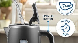 The kettle offers a generous 1.7L capacity, allowing up to 7 standard cups to be boiled at once. Its rapid boil design, easy-fill push button lid, and 360-degree power base make it simple to use from any angle, while the 3-way safety system supports confident everyday operation. Soft glow illumination adds a premium finishing touch, creating a warm visual effect during use.