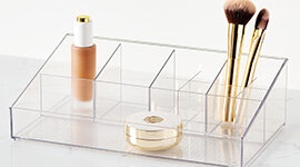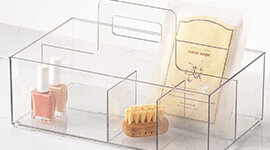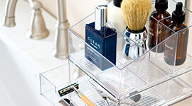 The Container Store Bath & Cosmetic Packs are designed to create a structured, clutter-free environment across vanities, drawers, and bathroom shelves. Featuring a curated selection of stacking organisers, drawers, angled cosmetic holders, and caddies, each pack provides clearly defined storage zones for skincare, makeup, hair tools, and everyday essentials.
