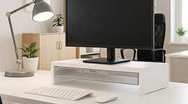 Monitor risers elevate screens to a more comfortable viewing height while providing additional storage underneath, helping reduce desktop clutter. Integrated drawers offer discreet storage for frequently used items without sacrificing accessibility.
