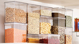 Clear PET construction ensures full visibility of contents, making it easy to monitor quantities and locate ingredients quickly. Airtight canisters help maintain freshness, while modular shapes allow for efficient vertical stacking. Divider bins and tiered organisers create designated sections for snacks, baking ingredients, spices, and pantry staples, reducing clutter and improving accessibility.