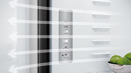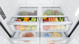 FreshSeal crispers with manual humidity control create the ideal environment for fruit and vegetables, helping reduce moisture loss and extend freshness. Beneath them, two dedicated FreshDrawers provide convenient storage for meats and deli items, keeping shelves clear and ingredients organised. The Multi-flow airflow system ensures consistent cooling throughout every compartment.