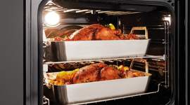 The oven boasts a spacious interior with different shelving options. Prepare large dishes for entertaining and family-satisfying Sunday roasts. The easy-guide side racks make placing your shelves in the oven effortless.