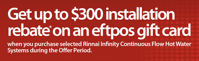 Get up to $300 installation rebate* when you purchase selected Rinnai Infinity Continuous Flow Hot Water Systems during the Offer Period.