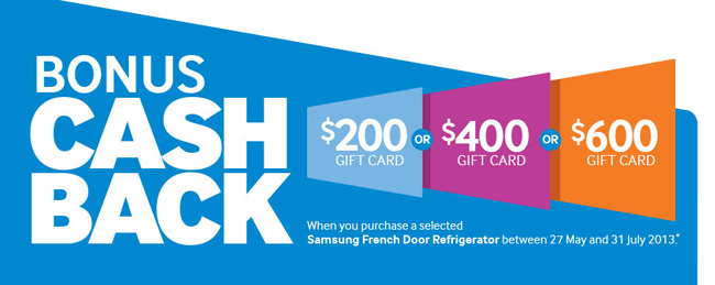 Purchase a selected Samsung French Door refrigerator, enter their details online at Samsung Promotions with proof of purchase (including receipt and serial number) and once claim is approved you will be sent a Citi Bank gift card in the mail.